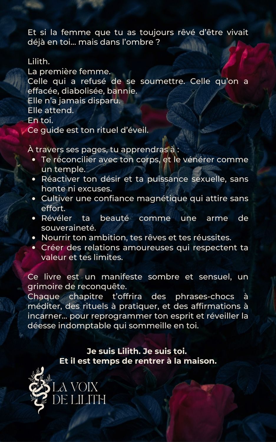 Il t’emmène au cœur de toi-même, là où vivent encore la honte, la peur, la retenue, pour y réveiller la femme que tu es vraiment : une déesse, une sorcière, une amante de la vie.